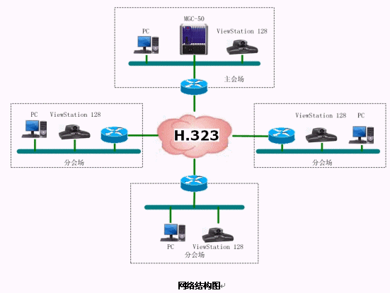 結(jié)合遼寧省消防網(wǎng)絡(luò),本方案設(shè)計(jì)的視頻會(huì)議系統(tǒng)承載在遼寧省消防局的IP網(wǎng)絡(luò)平臺(tái)上,采用國際流行的ITU H.323通信標(biāo)準(zhǔn)。系統(tǒng)采用以MCU為中心輻射各個(gè)會(huì)場電視會(huì)議終端的星型網(wǎng)絡(luò)結(jié)構(gòu)。整套系統(tǒng)由16個(gè)會(huì)場組成,采用美國Polycom公司的ViewStation 128會(huì)議室型終端設(shè)備。網(wǎng)管中心安放一臺(tái)Polycom 公司的MGC-50(多點(diǎn)會(huì)議控制單元),用于對(duì)全網(wǎng)終端的控制,實(shí)現(xiàn)多點(diǎn)、點(diǎn)對(duì)點(diǎn)的會(huì)議。