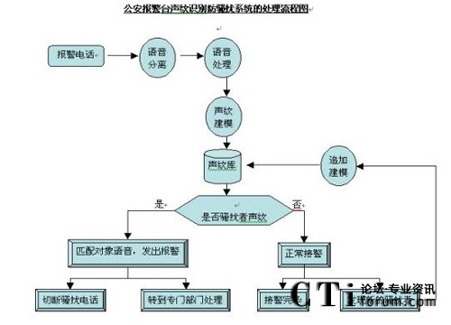 公安報(bào)警臺聲紋識別防騷擾系統(tǒng)的處理流程為:
