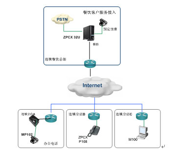 在總部選用ZPCX32U作為系統(tǒng)核心平臺,提供中繼接入和總部辦公電話分機,內(nèi)置IVR等擴展功能,作為該企業(yè)統(tǒng)一接入門戶和組網(wǎng)核心平臺。