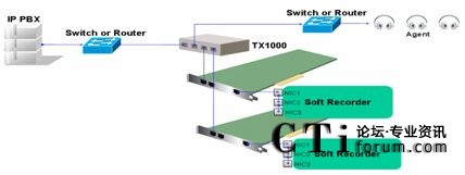 IP話機(jī)的錄音示意圖和圖1-4 E1/T1數(shù)字線錄音示意圖類似。不過(guò)此時(shí)PBX與IP話機(jī)之間的連線改成網(wǎng)線(RJ45)了。并且在兩個(gè)設(shè)備之間多了個(gè)并接設(shè)備TX100,其示意圖如下: