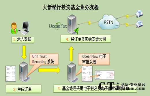 大新銀行采用OceanFax傳真服務(wù)器收發(fā)電子傳真,并將OceanFax與Unit Trust Reporting 系統(tǒng)及OceanFlow電子審批系統(tǒng)整合,理順投資基金流程,包括訂單生成、審批及傳真發(fā)送,實(shí)現(xiàn)完美自動流程,提高效率、降低成本及保證信息安全。