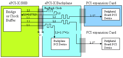 由于加了PCI-X,底板上的時(shí)鐘的長(zhǎng)度就成為關(guān)鍵了。規(guī)范的作者要定義應(yīng)能與各種底板互操作的SHB。這挑戰(zhàn)是在SHB上的PCI-X接口需要一個(gè)具有相等于底板上時(shí)鐘走線長(zhǎng)度延時(shí)的反饋時(shí)鐘。這反饋時(shí)鐘是在底板上并且它的長(zhǎng)度是以從SHB插槽到PCI插板插槽的時(shí)鐘的長(zhǎng)度為基礎(chǔ)的。在下面畫的圖中,從橋到三個(gè)目的地中任何一個(gè)的時(shí)鐘距離是相同長(zhǎng)度的。