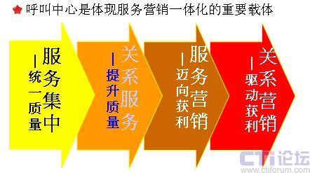 呼叫中心是體現(xiàn)服務(wù)營銷一體化的重要載體。我在前面已經(jīng)說了,服務(wù)和營銷一個是被動一個是主動,一個inbound一個outbound,呼叫中心可以非常完整地將兩者融合到一起,它是一個非常重要的服務(wù)營銷的載體。我們從呼叫中心整個營銷策略的進程當中,可以看到非常明顯的四個階段: