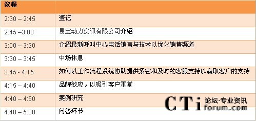 易寶動力資訊有限公司誠摯邀請您出席2010年1月22日舉行的研討會,在此將展示易寶的偉思聯(lián)絡(luò)中心CRM解決方案結(jié)合全面化工作流程和服務(wù)臺功能,如何有助您擴(kuò)大銷售渠道,贏取客戶支持,微調(diào)市場預(yù)測及提升品牌以吸引忠誠客戶的支持。