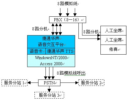 適用于中小型企事業(yè)單位的分布式客戶服務(wù)系統(tǒng)。特點是一半的線路資源用于交互系統(tǒng),另一半線路資源用于向分布下達服務(wù)指令。采用該方案的最大好處就是用戶的服務(wù)請求能夠以最快的速度自動分配到最合適的服務(wù)分站中,再由服務(wù)分站根據(jù)客戶的具體要求執(zhí)行服務(wù)。