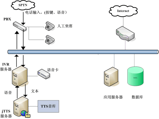 jTTS在12320中的應(yīng)用主要表現(xiàn)在查詢結(jié)果的語音返回和服務(wù)信息的發(fā)布上。只要將捷通TTS服務(wù)器集成到現(xiàn)有的IVR系統(tǒng)中,并且在IVR服務(wù)端設(shè)置好預(yù)讀出的文本即可。眾所周知,“12320”公益服務(wù)熱線需要提供海量關(guān)于我國公共衛(wèi)生相關(guān)法律法規(guī)、各種重大疾病的預(yù)防保健知識的宣傳和咨詢服務(wù),如果采用傳統(tǒng)人工座席或請專業(yè)播音人員錄音,費(fèi)時費(fèi)力,且投入較大。用語音合成技術(shù)(TTS)來解決,用戶提交查詢請求,IVR服務(wù)器收到請求后會向其他應(yīng)用服務(wù)器提交,當(dāng)IVR得到查詢結(jié)果后,將文本形式的查詢結(jié)果交給jTTS服務(wù)器,jTTS服務(wù)器返回查詢結(jié)果的語音形式,最終語音在坐席上播放,用戶就可以聽到所要查詢的信息(如圖)。這樣市民可以24小時撥打熱線,查詢各方面的內(nèi)容,不受時間限制,既節(jié)約政府開支,為民辦實事,而且在最大程度上提高了辦事效率,樹立了良好的政府形象。