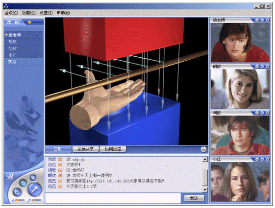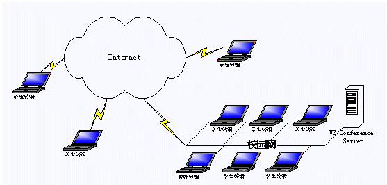 應(yīng)用V2 遠(yuǎn)程教育平臺,教學(xué)和遠(yuǎn)程培訓(xùn)都可以在線進(jìn)行。學(xué)生和教師利用各自的客戶端通過網(wǎng)絡(luò),進(jìn)入一個虛擬課堂,在教師與學(xué)生、學(xué)生與學(xué)生之間建立起語音和視頻的雙向交流、課件教學(xué)、在線會話和白板溝通的環(huán)境,實現(xiàn)教學(xué)功能。