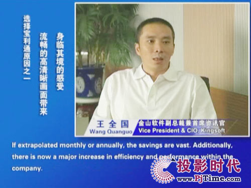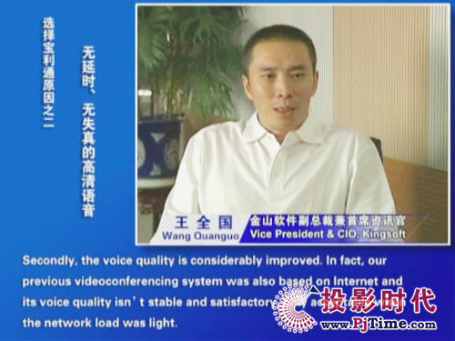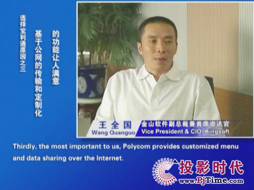 金山軟件副總裁兼首席資訊官王全國先生說道:“對于軟件行業(yè)來說,及時、高效的溝通是保持競爭優(yōu)勢的重要前提。相比之前使用的標(biāo)清產(chǎn)品,寶利通高清視頻會議系統(tǒng),提供了完全不同的體驗,流暢的高清晰畫面猶如真實的面對面溝通。而且我們公司并沒有申請專線,所有的應(yīng)用都是基于公網(wǎng)實現(xiàn)的。另一方面,新型全中文定制菜單的運用,令我們使用起來非常方便,這更提高了我們使用視頻通信手段實現(xiàn)異地溝通的熱情。”