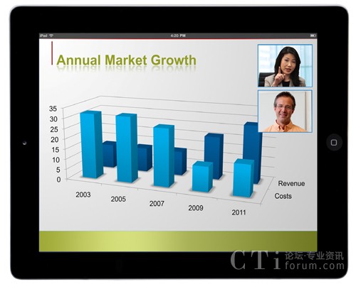 現(xiàn)在,在視頻通信需求增長(zhǎng)、勞動(dòng)力越來(lái)越偏遠(yuǎn)以及技術(shù)進(jìn)步的推動(dòng)下,移動(dòng)視頻會(huì)議正在顯著增長(zhǎng)。今天的企業(yè)往往在地域上越來(lái)越分散,越來(lái)越虛擬,全球遠(yuǎn)程辦公人員已超過(guò)10億。同時(shí),技術(shù)的進(jìn)步也推動(dòng)了視頻移動(dòng)社會(huì),包括配有攝像頭的移動(dòng)平板電腦和智能手機(jī)的普及;3G、4G和Wi-Fi網(wǎng)絡(luò)的出現(xiàn);以及云服務(wù)。事實(shí)上,Gartner仍然看好多媒體平板電腦市場(chǎng)帶來(lái)的機(jī)會(huì),據(jù)他們預(yù)測(cè)到2015年平板電腦將售出3.2億部,到年底,累計(jì)銷(xiāo)售將超過(guò)9億部。到2015年,采用視頻聊天的人數(shù)預(yù)計(jì)將增長(zhǎng)14倍,超過(guò)1.4億人。