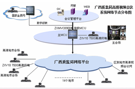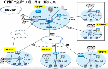 憑借全面的融合通信產(chǎn)品和解決方案、豐富的電子政務工程建設(shè)和實施經(jīng)驗,中興通訊為廣西“金質(zhì)工程”(一期)系統(tǒng)“量身定做”出一整套基于IP融合、使用方便靈活的解決方案:將整個系統(tǒng)分為兩個部分,即區(qū)質(zhì)監(jiān)局一級節(jié)點信息中心、各地市質(zhì)監(jiān)局及相關(guān)研究機構(gòu)共計15個二級節(jié)點信息中心,在管理上體現(xiàn)垂直的系統(tǒng)架構(gòu)。整個網(wǎng)絡可以看作一個分級的星形網(wǎng)絡,結(jié)構(gòu)簡單、易于擴展。
