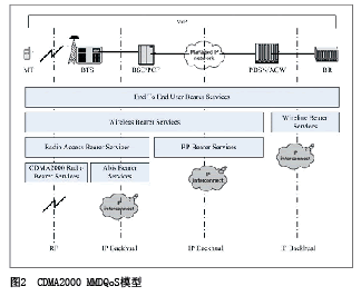 如圖2, CDMA2000 MMD QoS模型是由終端、接入網(wǎng)絡(luò)和核心網(wǎng)絡(luò)共同保證。終端和無(wú)線接入網(wǎng)之間的空中接口定義相關(guān)的QoS服務(wù)參數(shù)和級(jí)別;在無(wú)線接入網(wǎng)BSC和PCF之間的A8接口以及PCF和PDSN/AGW之間的A10接口上分配滿足用戶已被授權(quán)的QoS要求的資源;核心網(wǎng)提供在PDSN/AGW和邊界路由器(BR)之間的QoS服務(wù)。