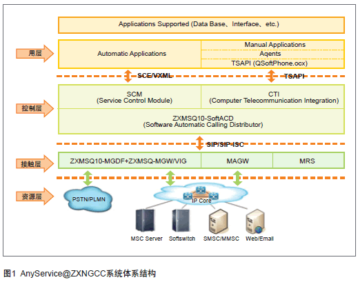 中興通訊AnyService@ZXNGCC多媒體統(tǒng)一接觸中心系統(tǒng)以中興通訊ZXMSQ10多媒體軟排隊(duì)機(jī)系統(tǒng)為基礎(chǔ),基于軟交換技術(shù)。ZXMSQ10由接入網(wǎng)關(guān)和軟排隊(duì)機(jī)兩個(gè)核心部件組成,語(yǔ)音、視頻呼叫(呼入和呼出)通過(guò)ZXMSQ10多媒體軟排隊(duì)機(jī)匯聚到AnyService@ZXNGCC系統(tǒng),其他媒體通過(guò)MAGW接入到NGCC系統(tǒng),同時(shí)AnyService@ZXNGCC也選擇最佳的媒體類(lèi)型將信息主動(dòng)反饋給用戶,形成雙向溝通的渠道,實(shí)現(xiàn)呼叫中心系統(tǒng)的被動(dòng)服務(wù)和主動(dòng)服務(wù)。