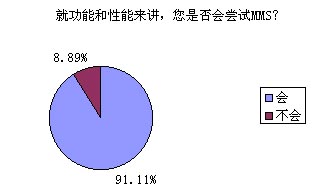 題8的調(diào)查結(jié)果對(duì)于中國(guó)移動(dòng)來(lái)講絕對(duì)是充滿誘惑的,高達(dá)91.11%的被訪者表示他們非常愿意嘗試MMS的功能和服務(wù),無(wú)疑這對(duì)ICP們(MMS服務(wù)的重要載體)也是一針強(qiáng)心劑。