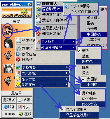 2、在其中某好友頭像上左鍵單擊,在彈出快捷功能菜單中,可隨時(shí):查看好友相關(guān)資料的更改、刪除某人;即時(shí)/語(yǔ)音聊天、傳送文件、發(fā)送DICO郵件;個(gè)人服務(wù)(WEB/ETP)及使用共享插件等。