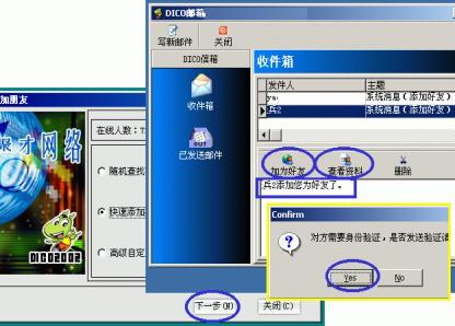 3、點(diǎn)按主窗口下方的"覓友"按鈕,彈出的對(duì)話(huà)框中選擇三種添加方式之一后按"下一步"進(jìn)行好友的添加;當(dāng)有人加你為好友時(shí),系統(tǒng)會(huì)有提示音閃并DICO圖標(biāo)在任務(wù)欄不斷閃爍,你點(diǎn)擊上來(lái)后會(huì)彈出你的DICO郵箱對(duì)話(huà)框并收到有某某加你為好友的消息,此時(shí)可先點(diǎn)按"查看資料"了解一下來(lái)人相關(guān)信息;若有意可點(diǎn)按"加產(chǎn)好友"加來(lái)訪者為好友(下圖7)。