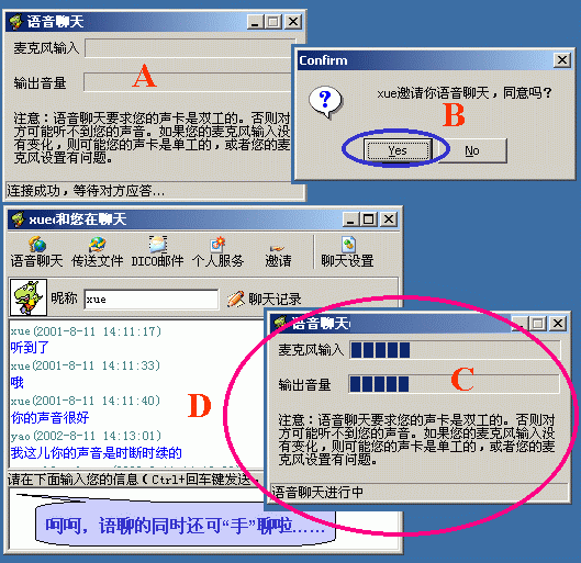在好友窗口內(nèi)單擊某"在線(xiàn)好友頭像"后選"語(yǔ)音聊天"命令(或在即時(shí)聊天窗口中點(diǎn)按"語(yǔ)音聊天"按鈕)后,主動(dòng)方彈出"正等待對(duì)方應(yīng)答窗口提示";而被叫方會(huì)彈出"應(yīng)答與否的窗口","YES"后雙方即可聊了(下圖9)。而且,它不受防火墻的限制(下圖就是我與一個(gè)在防火墻后的朋友的聊天界面)。在這一點(diǎn)上,QQ就望塵莫及了!