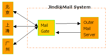 如果選用Jindi MailServer作為外部郵件服務(wù)器,可以在同一臺外部郵件服務(wù)器上配置可選的MailGate模塊,該模塊可以將指定域用戶的郵件進(jìn)行定向投遞,而不依賴DNS的配置。內(nèi)部郵件通過內(nèi)部DNS在郵件網(wǎng)關(guān)處進(jìn)行存儲轉(zhuǎn)發(fā)到外部。