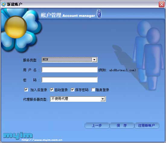 先添加相應(yīng)的賬戶;點(diǎn)擊"添加新賬戶"按鈕,彈出"賬戶管理"頁面,在"服務(wù)類型"的下拉列表中選擇相應(yīng)的服務(wù)類型,再依次輸入用戶名和密碼;設(shè)定完成后點(diǎn)擊"保存"即完成新賬戶的添加;保存完畢后myim自動(dòng)返回登錄界面。