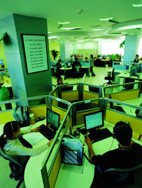 “目前這里每天要處理2000多個電話,一個月的電話量累計高達8萬個。每個坐席代表平均每天處理電話60次左右!彼上码娖鳎ㄖ袊┯邢薰矩撠熀艚兄行臓I運的CRM推進部副部長陳文凱說,“這是一個不輕松的工作崗位,因此,坐席代表的工作環(huán)境和工作待遇得首先得到保證。只有讓他們心情愉快,他們才能笑著去服務客戶!边@個寬敞舒適的工作大廳,就是基于這樣的思路設計出來的。每個坐席代表置身于扇形柔色的工作空間內,既能精力集中,又能避免回復電話的聲音互相干擾,一定角度的扇形空間發(fā)揮了最大的吸音效果。在大廳旁邊,還專設坐席代表休息室,每工作2小時后,他們可以到休息室休息一會。