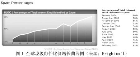 圖1來自著名的反垃圾郵件先鋒Brightmail公司的網(wǎng)站,顯示了最近12個(gè)月來,全球范圍內(nèi)垃圾郵件在所有郵件中所占比例的增長(zhǎng)曲線圖。按Brightmail的統(tǒng)計(jì)結(jié)果,2003年3月,垃圾郵件在全球郵件總量中的比例是45%,其后的一年間,平均每個(gè)月增長(zhǎng)兩個(gè)百分點(diǎn)。到了今年2月,這個(gè)比例已經(jīng)達(dá)到62%,也就是說,現(xiàn)在全球每5封電子郵件中就有3封是有害無益的垃圾郵件。