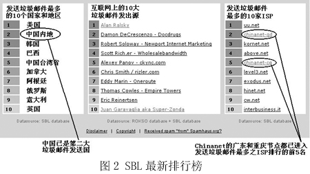 圖2是國(guó)際上著名的反垃圾郵件組織Spamhaus在網(wǎng)站上列出的統(tǒng)計(jì)排行榜,“China”已經(jīng)穩(wěn)居第二大垃圾郵件發(fā)送國(guó)的位置,而右邊的一個(gè)排行榜則從另一個(gè)角度向我國(guó)敲響了警鐘——在專為發(fā)送垃圾郵件的ISP所列的黑名單SBL中,我國(guó)Chinanet的兩個(gè)省級(jí)ISP在前10名中分列第2和第5名。而Chinanet作為中國(guó)的公用信息互聯(lián)網(wǎng)絡(luò),是我國(guó)的Internet骨干網(wǎng),是國(guó)內(nèi)用戶接入互聯(lián)網(wǎng)的主要途徑之一!拔覀冋娌幌M赃@樣的方式‘揚(yáng)名海外’”,來自一家ISP的一位不肯透露姓名的女士說,“其實(shí)我們也是受害者!”