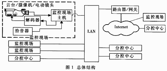 遠(yuǎn)程監(jiān)控系統(tǒng)一般包括三部分:前端監(jiān)控現(xiàn)場(chǎng)、通信設(shè)備和后端分控中心。整個(gè)系統(tǒng)基于Client/Server(客戶機(jī)/服務(wù)器)模式。總體結(jié)構(gòu)如圖1所示。