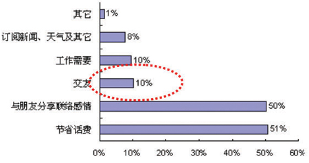 首先從使用目的看,我們的調(diào)查研究表明,大部分用戶(hù)使用短信最主要的目的是節(jié)省話(huà)費(fèi),該類(lèi)用戶(hù)比例高達(dá)51%; 其次是與朋友分享,以及聯(lián)絡(luò)感情,比例為50%; 而其他如交友、工作需要、訂閱新聞、天氣及其他等所占比例較低,均不超過(guò)10%。由此可見(jiàn),雖然短信業(yè)務(wù)已經(jīng)深入地滲透了用戶(hù)的生活,但是用戶(hù)的主要應(yīng)用仍然是點(diǎn)對(duì)點(diǎn)的應(yīng)用,信息類(lèi)的應(yīng)用只占很小的部分(見(jiàn)圖2)。