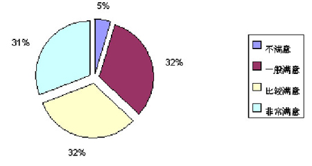 對(duì)于短信業(yè)務(wù)的使用情況,僅有31%的用戶(hù)認(rèn)為非常滿(mǎn)意,認(rèn)為比較滿(mǎn)意的用戶(hù)比較多,其比例占樣本總量的32%。認(rèn)為一般滿(mǎn)意和不滿(mǎn)意的用戶(hù)比例分別是32%和5%(見(jiàn)圖3)。