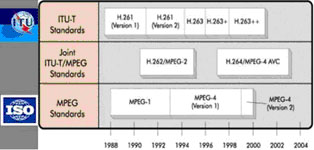 國際標準通常是由國際標準化組織ISO在國際電信聯(lián)盟 ITU的技術(shù)建議的基礎(chǔ)上制訂的。數(shù)字視頻編解碼標準也經(jīng)歷了多次變革,其演變進程如圖所示: