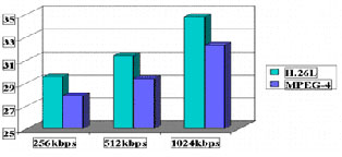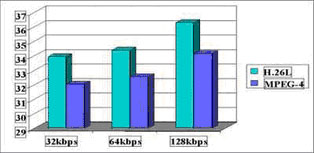 2、 H.26L在中低碼率下與MPEG-4比較: 在中低碼率(32-128Kbps)的情況下,H.26L與MPEG-4相比具有性能倍增效應(yīng)。