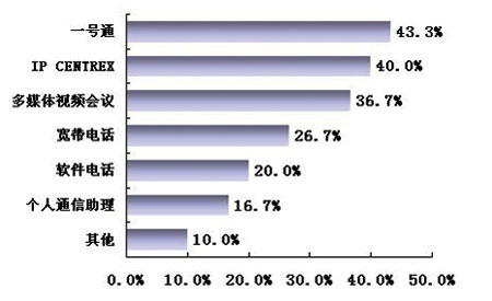 CENTREX感興趣的用戶為40.0%,對多媒體視頻會議感興趣的用戶達到36.7%,對寬帶電話感興趣的用戶達到26.7%。