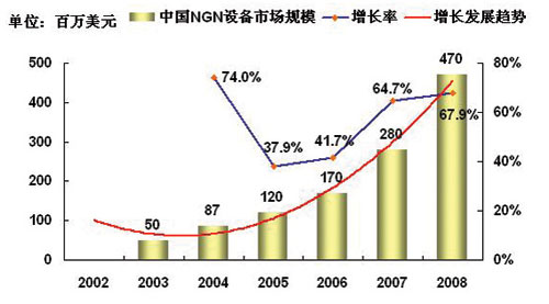 對于中國NGN市場規(guī)模的預(yù)測,主要取決于各個運營商在NGN方面的戰(zhàn)略發(fā)展重點,以及重點的投資方向?傮w上來說,從2003年起,以IPTV、VOIP、寬帶接入等業(yè)務(wù)為代表的NGN的部分業(yè)務(wù)的推廣,使得事實上中國已經(jīng)形成一定的NGN的市場規(guī)模,盡管這一市場規(guī)模仍然很小。2004年中國的NGN基礎(chǔ)設(shè)備的市場規(guī)模超過8千萬美元,以后隨著各個運營商NGN戰(zhàn)略的進一步清晰,這一部分的投資會保持持續(xù)穩(wěn)定的增長,2005~2008年以后的NGN設(shè)備投資規(guī)模的平均增長率可以達到50%。