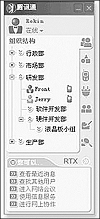與其他應用程序集成是EIM的發(fā)展趨勢,也是企業(yè)現(xiàn)代辦公的一大需求。目前,騰訊通RTX已成功與國內(nèi)著名的金碟、用友、北京慧點等軟件廠商開展合作,使騰訊通RTX的整體功能進一步提升,極大地方便了企業(yè)應用。比如通過與金碟OA的集成,實現(xiàn)了企業(yè)級實時通信平臺與企業(yè)管理軟件和信息化解決方案的緊密結(jié)合,從而更好地滿足客戶需求。通過與用友ERP集成,降低了企業(yè)通信時間和費用,提高了工作效率。