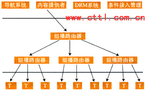 IPTV業(yè)務(wù)提供者可以根據(jù)用戶的請求,利用IP網(wǎng)絡(luò)本身所提供的組播能力將視頻信息以組播的方式傳送給用戶。此時,同時向相同的業(yè)務(wù)提供者請求發(fā)送相同內(nèi)容信息的用戶,可以由業(yè)務(wù)提供者安排在同一個組播組中接收到相同的信息。為給內(nèi)容提供者提供知識產(chǎn)權(quán)保護(hù),業(yè)務(wù)提供者提供條件接入控制。同時為減少骨干網(wǎng)絡(luò)傳輸?shù)膲毫,業(yè)務(wù)提供者在向眾多的用戶提供組播式業(yè)務(wù)時可以利用多級組播的形式來實(shí)現(xiàn)。組播式IPTV業(yè)務(wù)可能的系統(tǒng)模型示意如圖1所示。