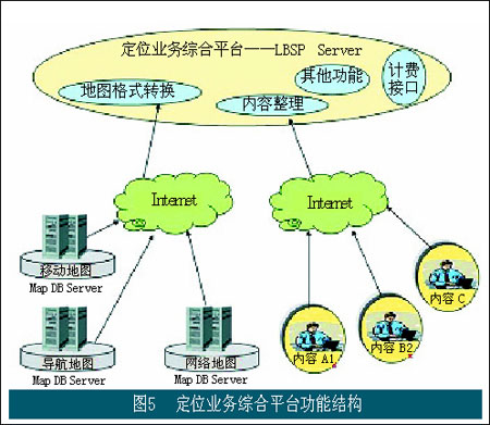 在上述結(jié)構(gòu)中,定位業(yè)務綜合平臺LBSP扮演著重要角色。其功能結(jié)構(gòu)如圖5所示。在該平臺中提供位置類信息業(yè)務的業(yè)務運營支撐功能,包括計費功能(以及和BOSS系統(tǒng)的接口);同時該平臺還扮演著接入不同內(nèi)容開發(fā)商的重要角色。不同的內(nèi)容開發(fā)和提供商通過該平臺向最終用戶提供具體的業(yè)務和應用,運營商通過該平臺對不同內(nèi)容開發(fā)商提供的內(nèi)容進行管理和整理,使面向用戶的應用能夠順利得到展現(xiàn)。該平臺提供的另一個重要角色是肩負著接入地圖信息提供商的重任,并在該平臺中通過地圖格式的轉(zhuǎn)換使不同地圖提供商所提供的地圖信息能夠以一致的格式向用戶提供。