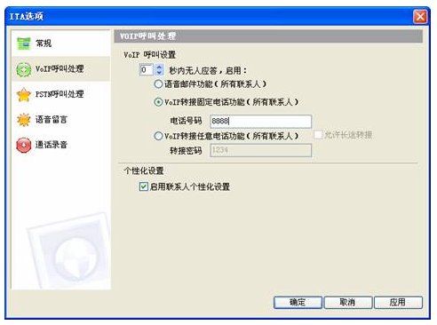 啟動(dòng) VoIP呼叫轉(zhuǎn)接固定電話功能,設(shè)置0秒啟動(dòng),轉(zhuǎn)接固定電話號(hào)碼為交換機(jī)內(nèi)置語音引導(dǎo)號(hào)8888,如圖,假設(shè)8888是交換機(jī)上配置的語音引導(dǎo)號(hào)。