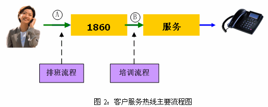 因此,根據(jù)客戶服務(wù)中心的實際情況,我們首先優(yōu)化了排班流程,建立并優(yōu)化了培訓流程。我們首先選擇這兩個流程的思路如下:從客戶角度來看,10086熱線在接受用戶咨詢服務(wù)時的主要流程如下:撥號→1860→服務(wù)提供→掛機。圖示如下: