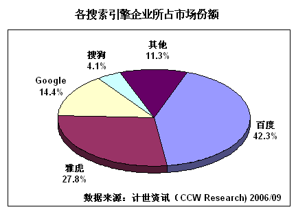 互聯(lián)網(wǎng)上的信息浩如煙海,是典型的信息爆炸,因此絕大多數(shù)網(wǎng)民都必須依靠搜索引擎才能找到所需信息,這個龐大的需求也就注定了搜索引擎市場的興旺繁榮。計世資訊(CCW Research)數(shù)據(jù)顯示:2004年中國的搜索引擎市場銷售總額達到9.4億元人民幣,增長67.9%,2005年繼續(xù)保持47.9%的增長速度,達到13.9億元,到2006年預計這個數(shù)字將突破20億元大關(guān)。
