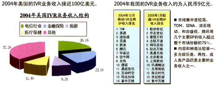 目前,國(guó)內(nèi)IVR的業(yè)務(wù)主要集中于為個(gè)人提供服務(wù)上,行業(yè)應(yīng)用所占比例較小,與成熟的國(guó)外市場(chǎng)以行業(yè)應(yīng)用為主的現(xiàn)狀形成巨大反差。而且,在為個(gè)人提供的語(yǔ)音業(yè)務(wù)中,國(guó)內(nèi)最受歡迎的仍是娛樂信息類中的聊天交友類業(yè)務(wù),這表明國(guó)內(nèi)個(gè)人用戶的需求層次較低;其次是娛樂和點(diǎn)播類的音樂類業(yè)務(wù);第三大類是游戲答題類,例如:知識(shí)競(jìng)猜、有獎(jiǎng)競(jìng)猜、角色扮演游戲、互動(dòng)游戲等;另外,IVR的數(shù)據(jù)業(yè)務(wù),如:短信、彩鈴、彩信等,受到近兩年國(guó)內(nèi)短信、彩鈴業(yè)務(wù)蓬勃發(fā)展的帶動(dòng),近兩年也呈現(xiàn)快速增長(zhǎng)的良好勢(shì)頭。