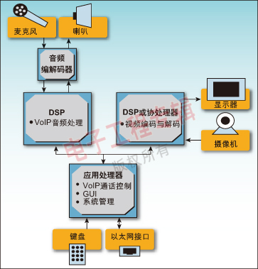 當今應(yīng)用處理器的處理能力的增加使得我們能使用先進的操作系統(tǒng)環(huán)境,例如嵌入式Linux來有效地將V2IP系統(tǒng)中需要的控制和媒體處理進行劃分。這反過來又使得使用單一處理器和工具鏈的軟件開發(fā)更加簡單,由于減少了一個或更多的昂貴DSP而降低了成本。
