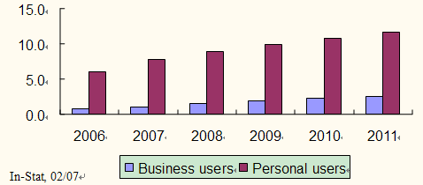 In-Stat預(yù)計(jì),到2011年中國手機(jī)電子郵件用戶達(dá)到1400萬戶,其中企業(yè)用戶達(dá)到250萬,個(gè)人用戶達(dá)到1170萬。2007到2011年,企業(yè)用戶年均復(fù)合增長率為24.8%,個(gè)人用戶年均復(fù)合增長率為10.6%。如下圖所示:
