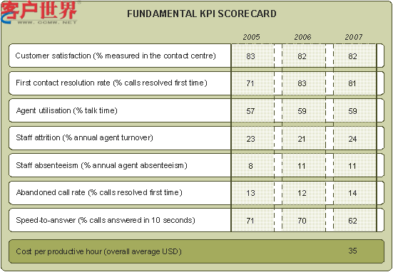 呼叫中心理論、實(shí)踐和投資三者相結(jié)合就會(huì)實(shí)現(xiàn)生產(chǎn)效率、生產(chǎn)效能、生產(chǎn)力和銷售業(yè)績(jī)的結(jié)合。2007計(jì)分卡顯示客戶滿意度得分很低。我們認(rèn)為呼叫中心必須采取一種正確的方式來理解此項(xiàng)活動(dòng)的真正的價(jià)值,以便更準(zhǔn)確地估測(cè)和報(bào)道客戶滿意度。