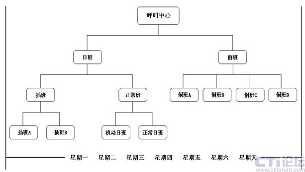 3)插班:插班人員的工作時間為8小時,該組人員的工作時間,可根據(jù)呼叫中心績效分析文檔中的高峰呼叫量來安排。