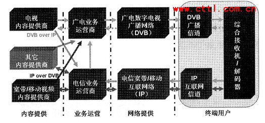 DVB技術通過廣電業(yè)務運營商來開展IPTV業(yè)務。由于廣電的業(yè)務通道是單向的,需要找到一條回路才能開展IPTV業(yè)務。這條回路既可以借助電信的業(yè)務通道來實現,也可以再重新鋪設一條回路(盡管再重新鋪設一條回路會由于從技術和經費上都需要巨大投入而使雙向改造實現起來十分困難,并且這種改造的投入和產出之間可能會產生相當大的差距,雖然可行性不大,但這畢竟是一種可以實現的解決方案)。