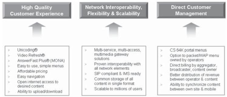 雖然視頻和多媒體服務(wù)的突然火熱對消費者、企業(yè)和業(yè)界來說都是件好事,但存在的挑戰(zhàn)還是很多,如怎樣提供高質(zhì)量的用戶體驗、解決手機(jī)和網(wǎng)絡(luò)可互操作性問題,以及集成商、廣播媒體和內(nèi)容提供商的直接用戶接觸與管理問題。這些問題的主要技術(shù)解決方案提供者有Unicoding、Video Refresh和AnswerFast Plus (MONA的一部分),同時多媒體網(wǎng)關(guān)解決方案也包括在內(nèi)。其它方面的可互操作性和用戶體驗改善問題很容易能解決,對今天現(xiàn)有的WAP服務(wù)是一種補(bǔ)充。