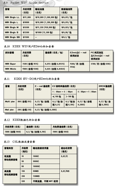 用戶(hù)使用WIN au手機(jī),通信包標(biāo)準(zhǔn)計(jì)費(fèi)為0.1日元/包(Packet)(含稅0.105日元),其中1Packe=128Bytes。KDDI為用戶(hù)提供分檔包月套餐,見(jiàn)表9。