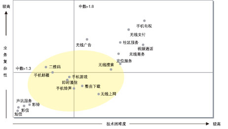 諾基亞西門子通信借鑒國外的無限增值業(yè)務(wù)經(jīng)驗(yàn)和對國內(nèi)運(yùn)營商業(yè)務(wù)的分析提出“技術(shù)困難度—業(yè)務(wù)復(fù)雜性”模型來詮釋無線增值業(yè)務(wù)。