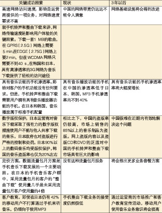 無線音樂市場的現(xiàn)狀、3年以后的情況以及成功的關(guān)鍵因素歸納總結(jié)見表2。