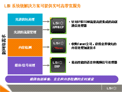 LSI的高級(jí)通信處理器可實(shí)現(xiàn)出色的服務(wù)質(zhì)量、高等級(jí)與流量管理能力,對(duì)于通過(guò)基于數(shù)據(jù)包的網(wǎng)絡(luò)交付像實(shí)時(shí)視頻這樣的新服務(wù)與服務(wù)而言,這些技術(shù)至關(guān)重要。由于網(wǎng)絡(luò)對(duì)高帶寬的需求越來(lái)越大,一般的網(wǎng)絡(luò)處理器可擴(kuò)展性跟不上網(wǎng)絡(luò)的發(fā)展步伐。然而,LSI 的 NPU 則能將數(shù)據(jù)和控制路徑分開(kāi),更加有效地交付媒體流,從而保證了實(shí)時(shí)可靠性和真正的線速性能。這樣移動(dòng)用戶可以享受到卓越的視頻質(zhì)量。
