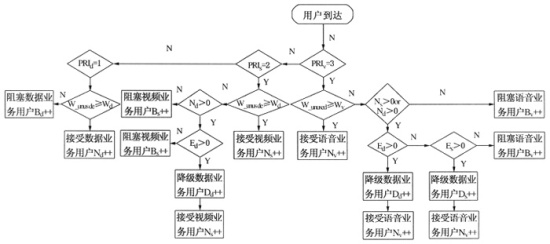 1)用戶到達(dá)事件。當(dāng)帶寬資源充裕時(shí),各類用戶到達(dá)不論優(yōu)先級高低,均可按需分配得到帶寬。當(dāng)帶寬資源不能滿足接入需求帶寬時(shí),則按照優(yōu)先級順序從低到高對已接入的用戶進(jìn)行QoS降級服務(wù)(降一級或若干級),直到能夠騰出足夠的帶寬滿足新用戶的需求,否則阻塞該用戶,具體流程如圖2所示。